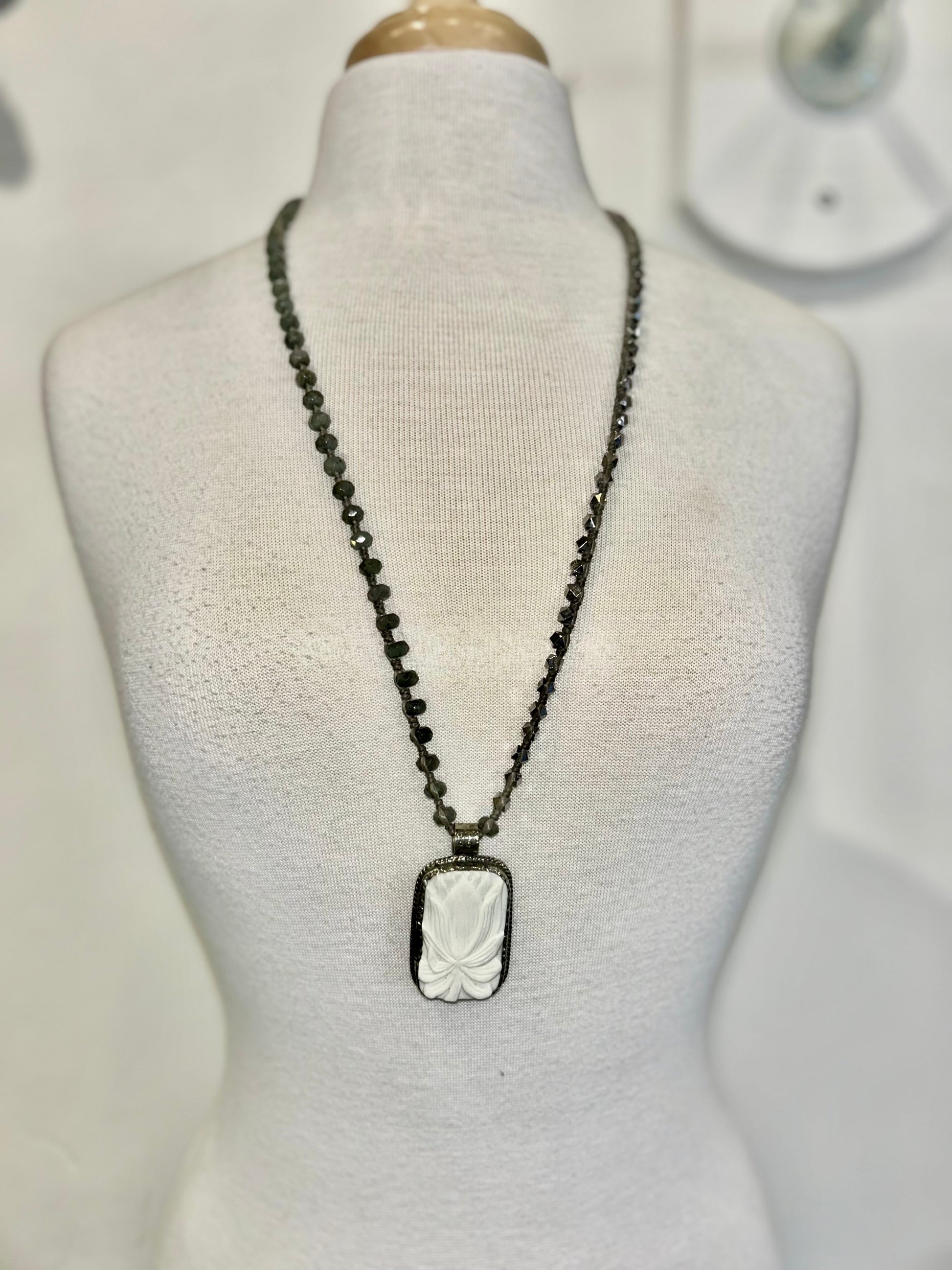 Add a touch of natural beauty to your style with the Carved Bone Lotus on Labradorite and Silver Beads by Paula Carvalho Designs. This delicate accessory features a stunning carved bone lotus flower, complemented by shimmering labradorite and silver beads. Elevate your look and embrace the beauty of nature with this unique piece.