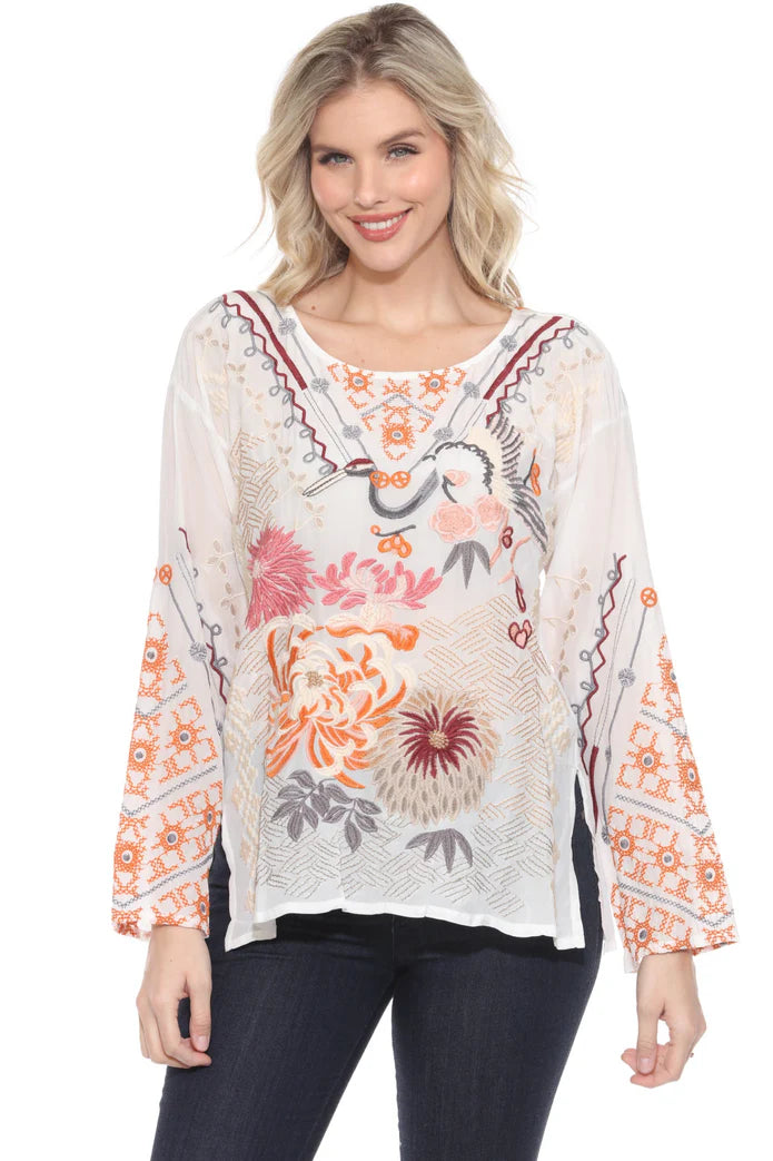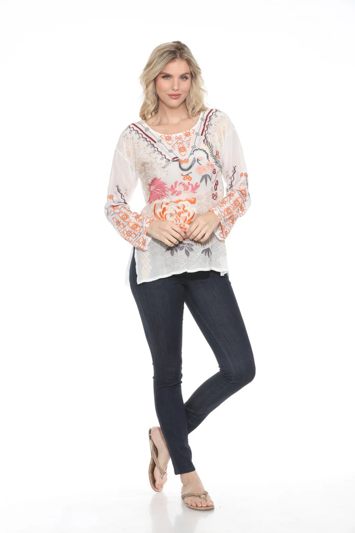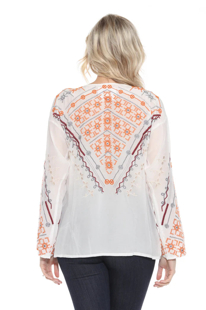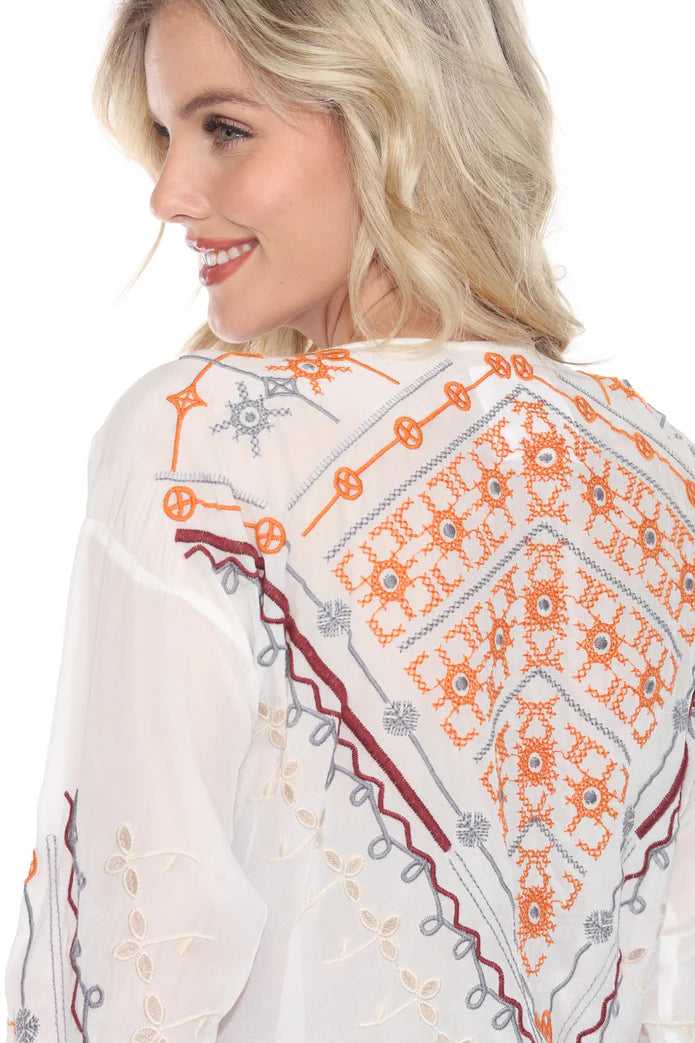 Introducing the Charlize Blouse, crafted by Johnny Was in a crisp, classic white. This versatile blouse is perfect for any occasion and can easily be dressed up or down. With delicate embroidery and a flowy fit, the Charlize Blouse will add a touch of elegance to any wardrobe.