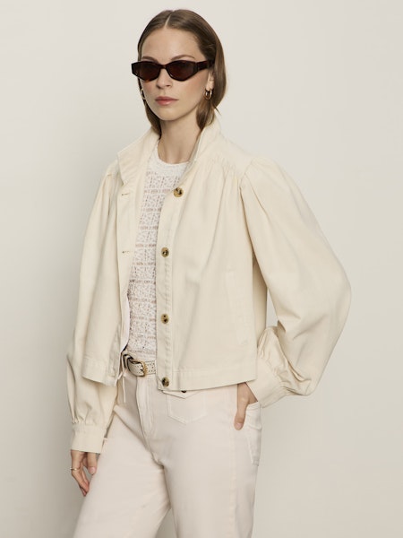 Make a style statement with this puff-sleeved twill jacket from Sanctuary, featuring a chic collarless design and side latch closure. Two side front pockets provide both function and a modern, utilitarian flair.