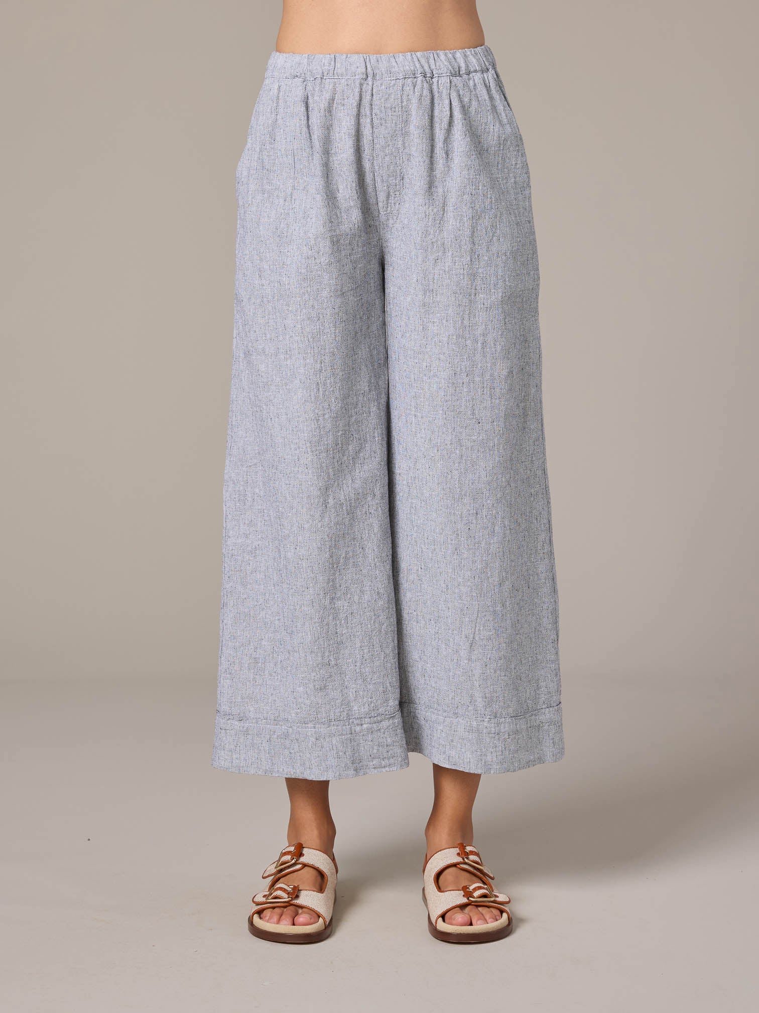 The Pleated Crop Pant features a full elastic waist band, side pockets, and an exposed seam on the bottom of each leg. Made in Crosshatch fabric, this linen-cotton blend combines natural texture with a lightweight, breathable feel. Sewn and dyed in San Francisco using non-toxic dye.