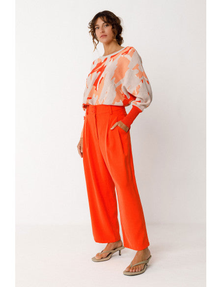 Lightweight organic cotton knit sweater with batwing sleeves. V-neck at the back and ribbed trim at the neckline, hem, and cuffs.