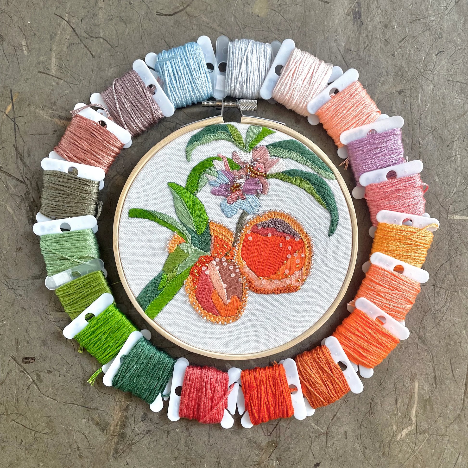 This DIY kit incorporates embroidery and beadwork to create a sweet set of peach blossoms. Beadwork accents highlight different parts of the flowers and fruit. This kit includes 19 DMC colors and 4 bead types. This kit is 5" in diameter. The instructions assume someone is a complete beginner and include step by step tutorials and links to videos on how to do the stitches for this pattern: long-armed feather stitch, French knots, satin stitch, and Pekinese stitch.