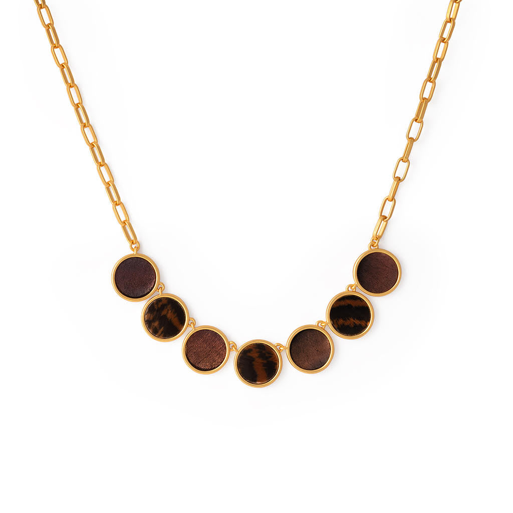 The Ellie Necklace is a refined showcase of nature’s artistry. Featuring alternating bezels of patterned and iridescent copper turkey feathers, this design highlights the feather’s inherent contrasts - from subtle striations to rich, luminous sheen. Thoughtfully arranged in a vertical sequence, each bezel captures a unique expression of texture and tone, creating a piece that feels both grounded and luminous. Ellie is the perfect blend of earthy elegance and modern form, designed to be worn solo or layered with intention.