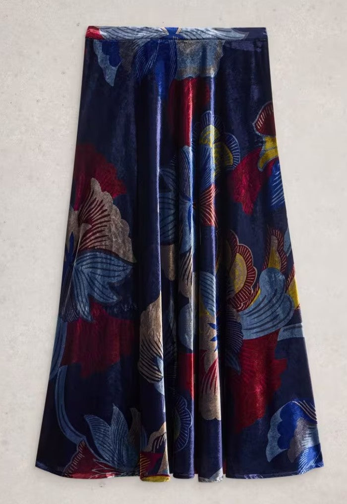 Something about this velvet skirt reminds us of water. Maybe it's the way the sheen catches the light as it moves. Or the flowing, fluttery shape of the hem.