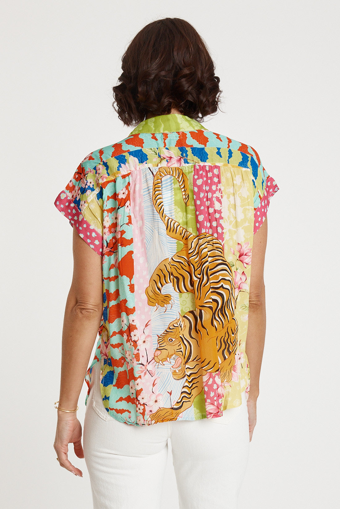 Soft, colorful, and effortlessly flattering, the LulaSoul Montage Top is designed for easy everyday wear with a modern, polished feel. Made from lightweight 100% viscose modal, it drapes beautifully and feels cool and breathable on the skin. The collared neckline and full button-through front add structure, while the capped sleeves with cuffs keep the look relaxed and feminine. Gathers from the shoulder yoke create gentle movement, and the curved hem offers versatile styling—perfect for wearing loose or tucked. Designed in Australia, Made in India