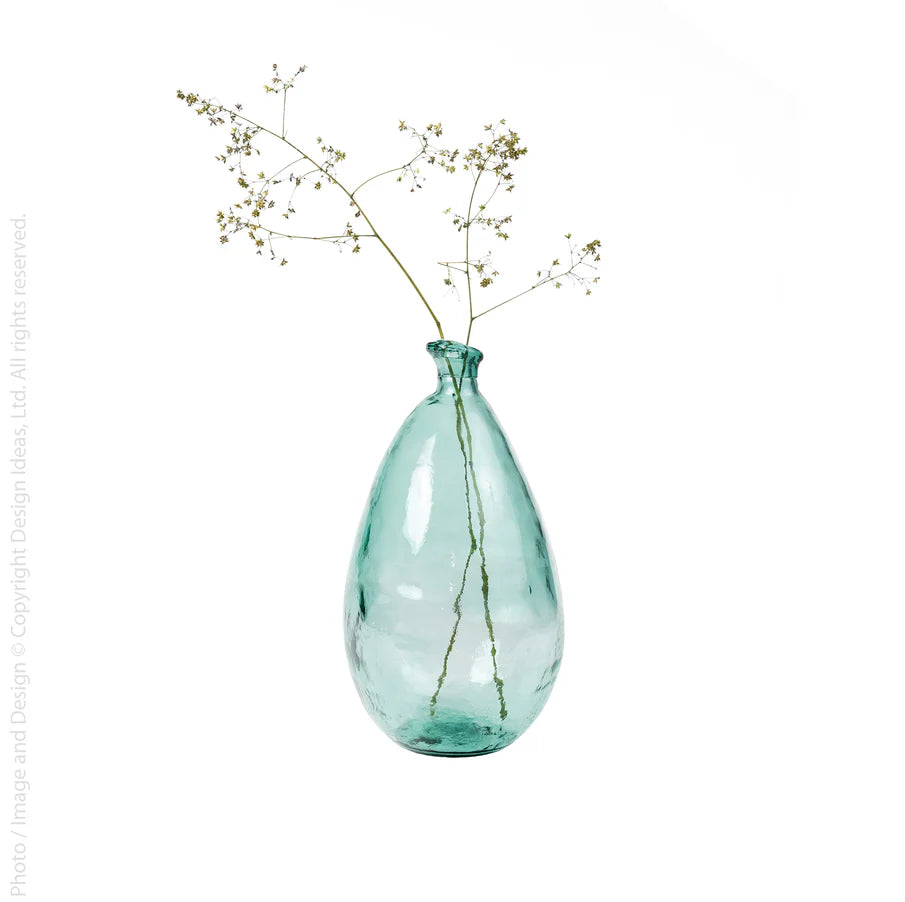 Elevate your space with the Nile River bottle, a testament to Mediterranean craftsmanship. Meticulously hand-blown from 100% recycled glass, this vessel serves as both a distinctive decorative accent and an elegant vase. Perfectly suited for showcasing flowers or branches, each piece carries subtle variations that reflect its artisanal heritage and environmental consciousness, adding refined character to any curated interior.