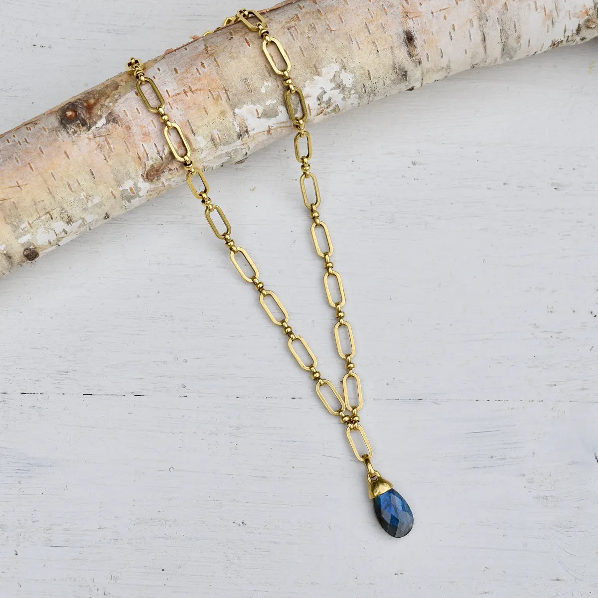 This is a faceted rainbow labradorite briolette pendant on antiqued gold vintage knot link chain with an antique gold lobster clasp enclosure. The necklace is adjustable up to 18 inches.
