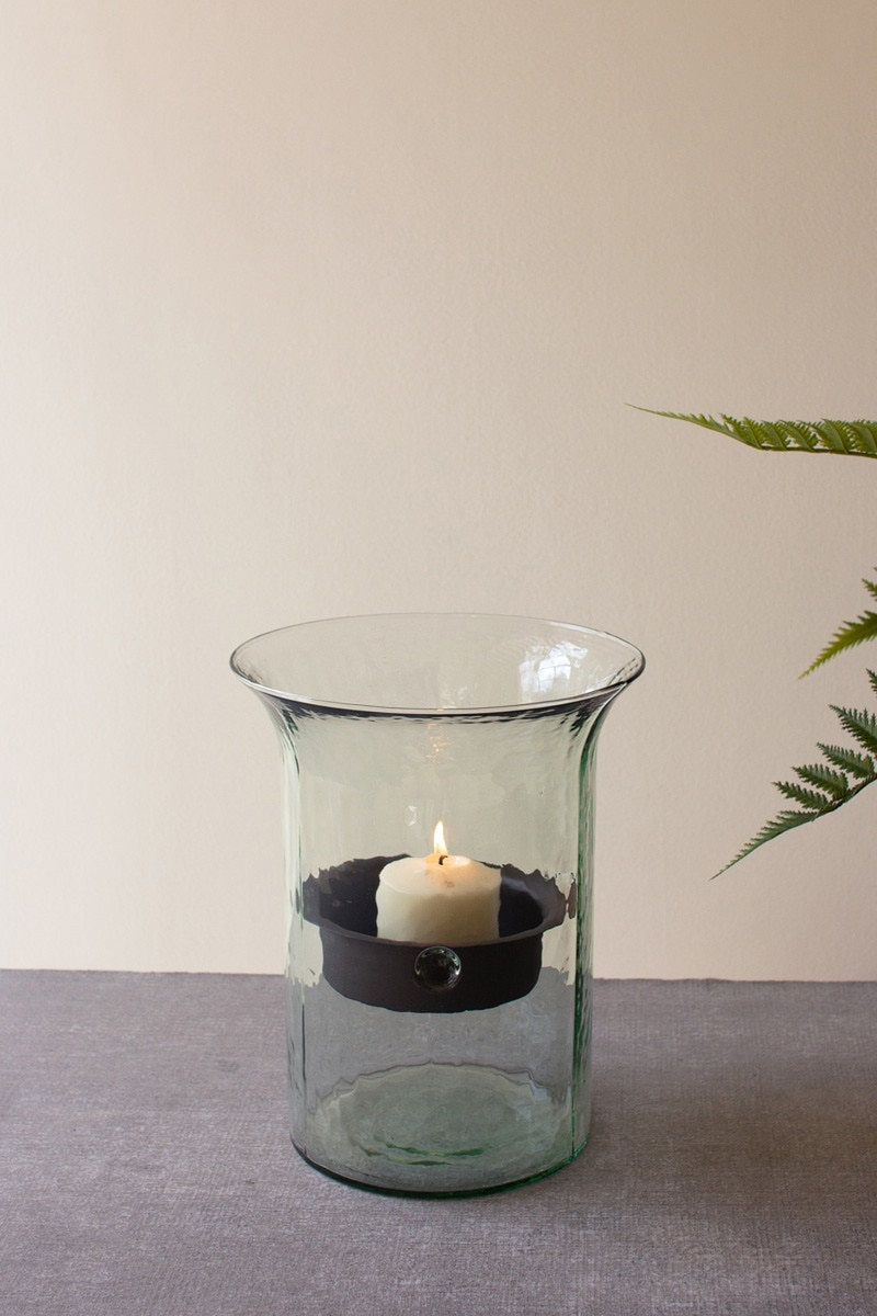 Hand blown Columbian glass has a rustic metal floating insert that can hold a 3" candle. Decorative items such as dried flowers, pinecones, or corks can be added to the bottom and changed for a seasonal look.