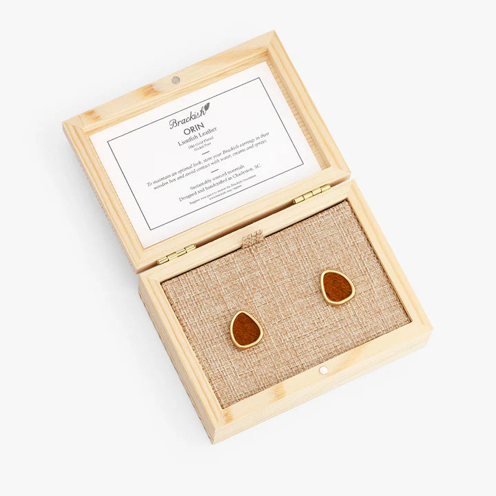 The Orin stud earrings are handcrafted using leather sourced from the invasive Lionfish, a threat to the native fish and environment in U.S. Atlantic coastal waters.