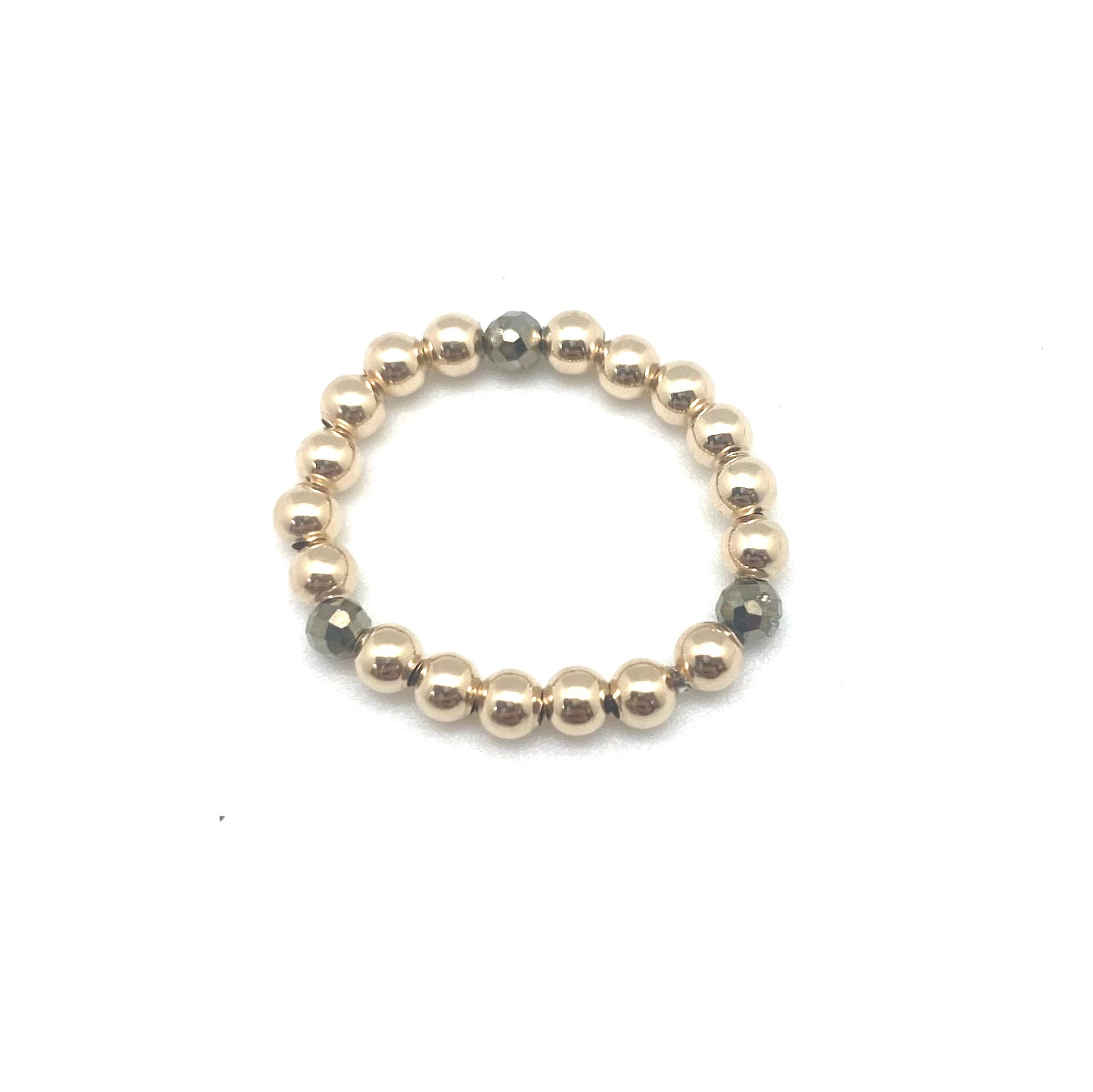The Pippi ring is made of 3 mm gold fill beads with accents of semi precious stones. The Pippi ring is strung on a strong elastic cord. One size fits most.