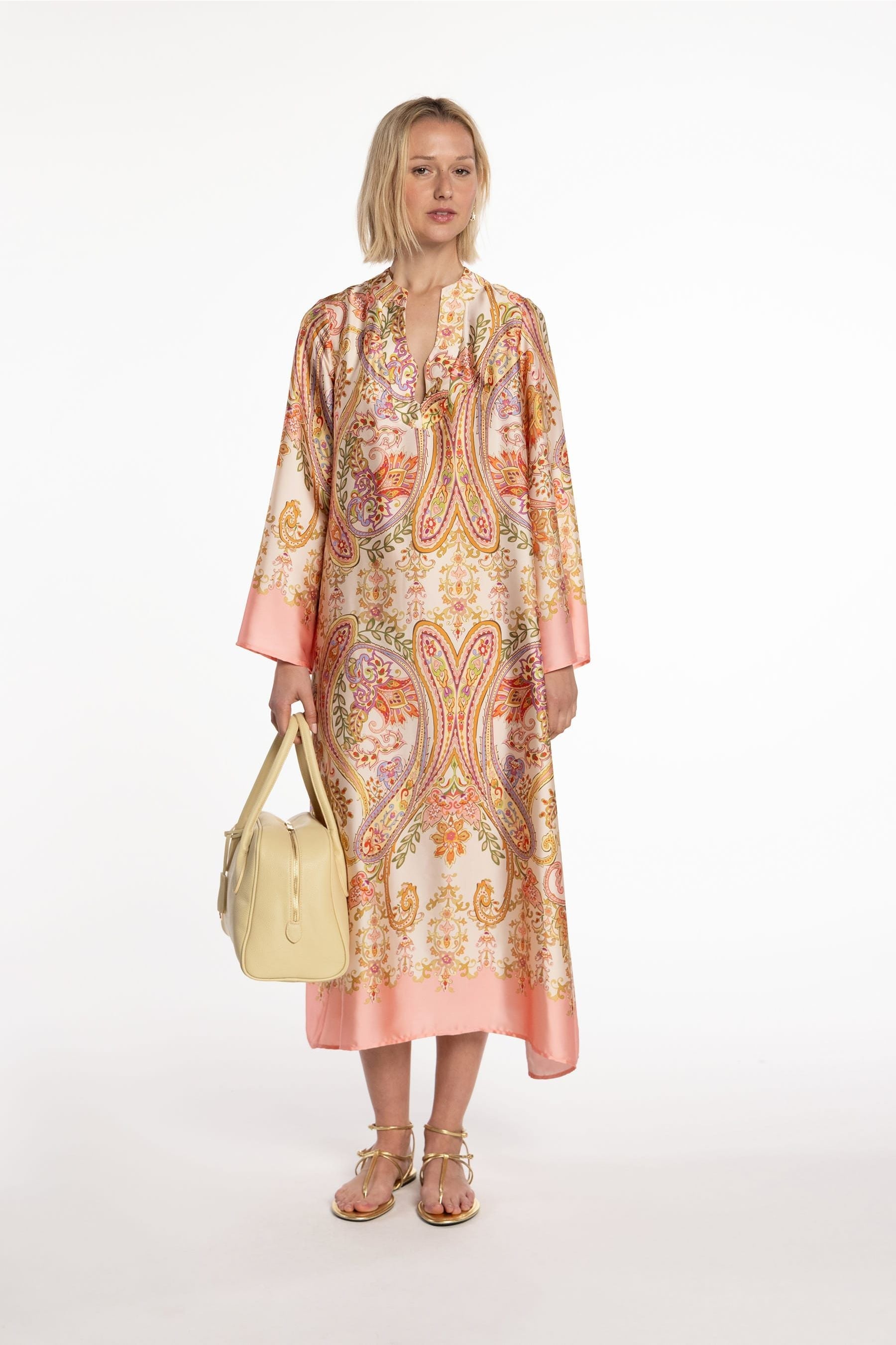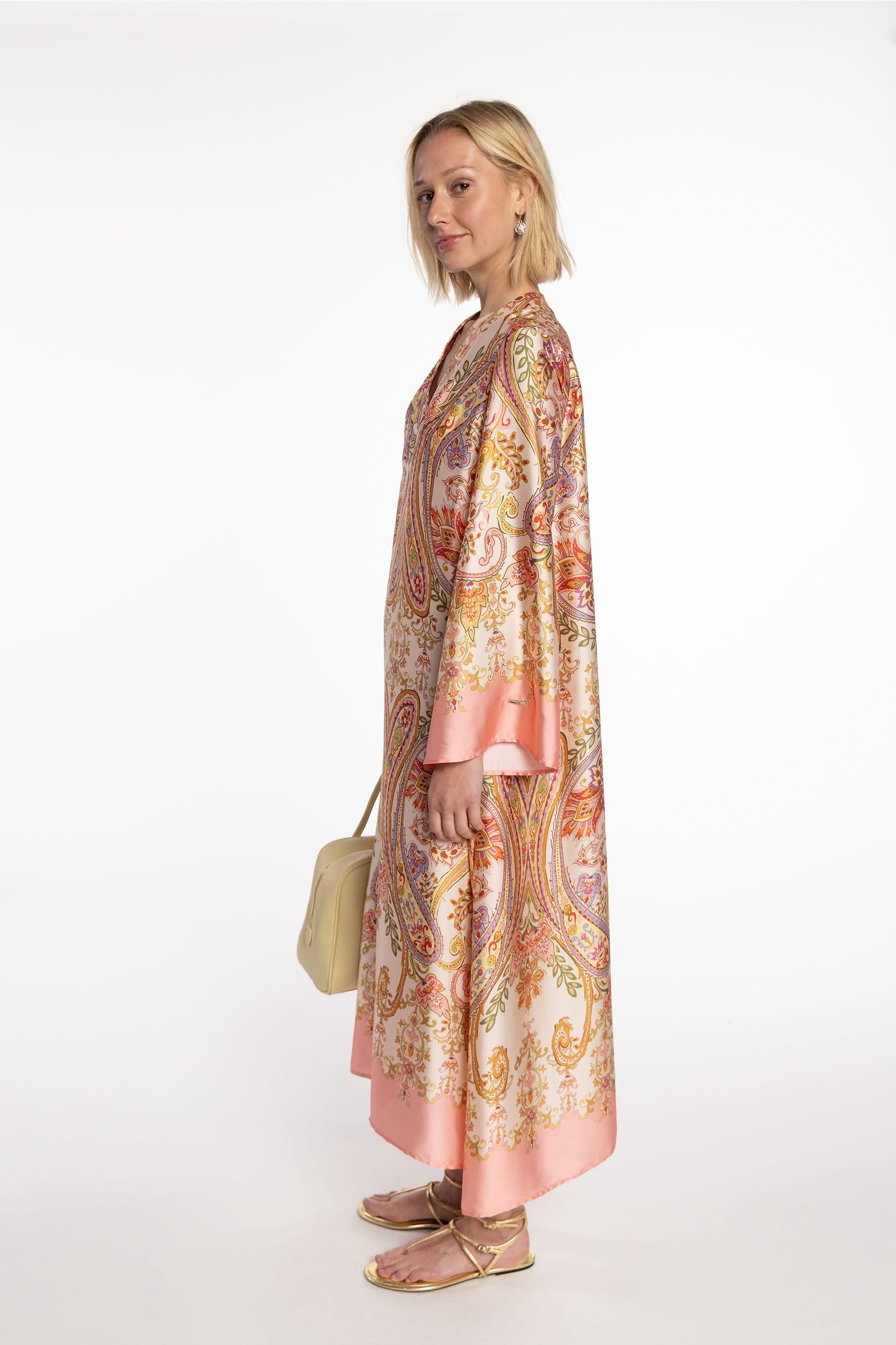 Maxi satin printed dress with delicate paisley motif. Featuring V-neckline and flared long sleeves. Ideal for both daytime and evening events.