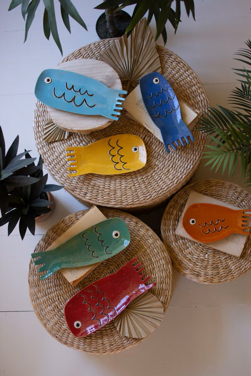 Every seaside retreat needs this set of six fish plates. Oblong plates in bright blues, reds, yellow, and green with scale and fin details go swimmingly with kitchen or coastal decor. Catch a set for yourself or reel one in for a friend. Set includes 6 pieces. One each color. Glazed front and back.