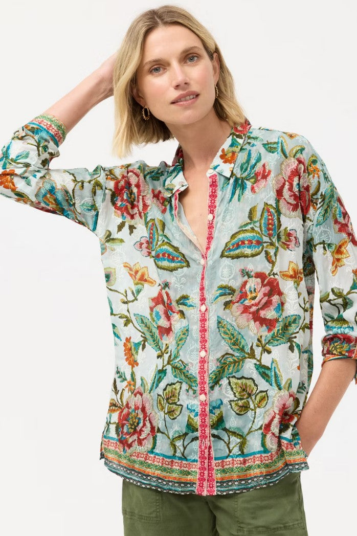 Embellished with a vibrant floral pattern, the Audrey Button Up Shirt is washed in brilliant color. Designed with a button-front and drop shoulders, this mesmerizing shirt is finished with roll-tab sleeves and side slits for a relaxed fit. Pair with palazzo pants and vibrant flats for a polished evening look.