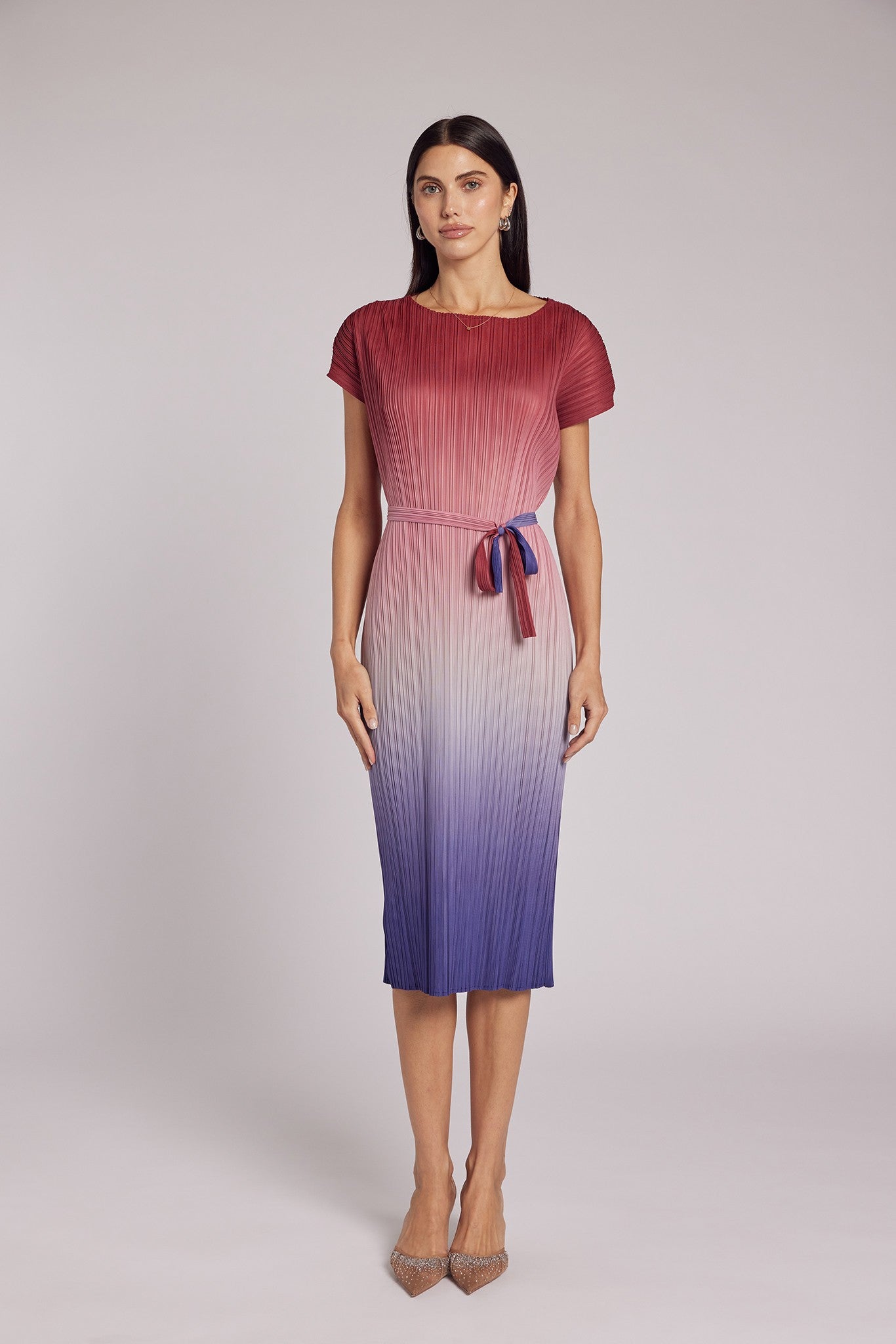 Introducing the Valentina Ombre Plisse Dress by Wild Cosmos. This stunning dress features a beautiful ombre design, sure to make a statement. The soft, plisse fabric adds texture and movement, making it a perfect choice for any occasion. Step into the sunset with style and confidence in this must-have dress.
