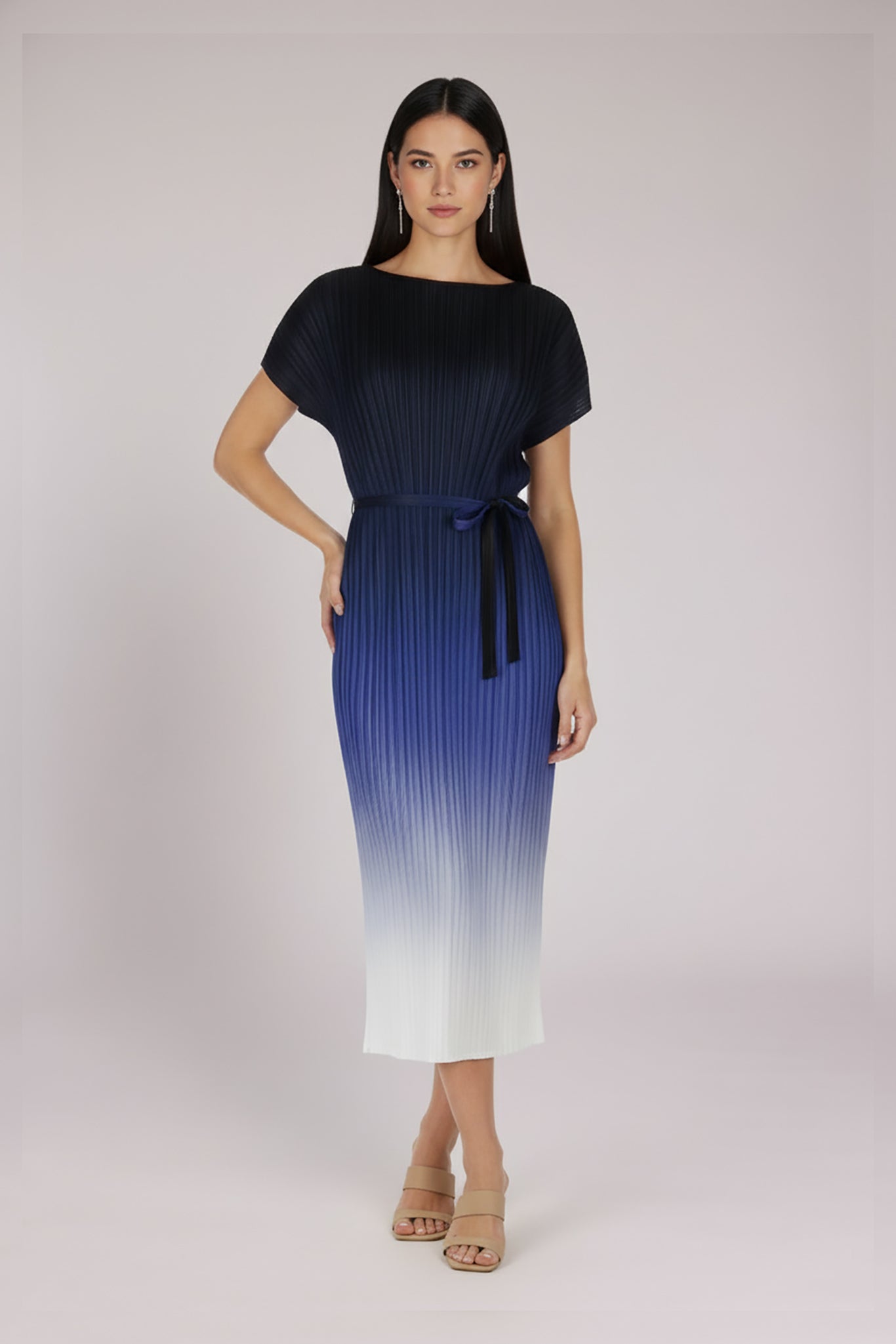 Transform your wardrobe with the Valentina Ombre Plisse Dress by Wild Cosmos. This stylish dress features an ombre design that fades from navy to multi-color, making it a versatile addition to your closet. Its pleated texture adds dimension and movement, perfect for any occasion. Upgrade your style with Valentina today.