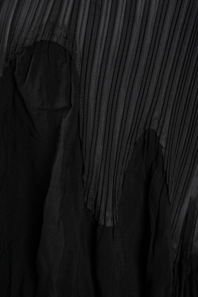 A refined blend of plissé satin and airy voile with a flattering, flowy silhouette that suits all body shapes. Finished with a jewel neckline, short sleeves, and soft ruffle hem. Pairs beautifully with the Miuna Skirt, sleek pleated separates, or your favorite jeans for a polished or casual look.